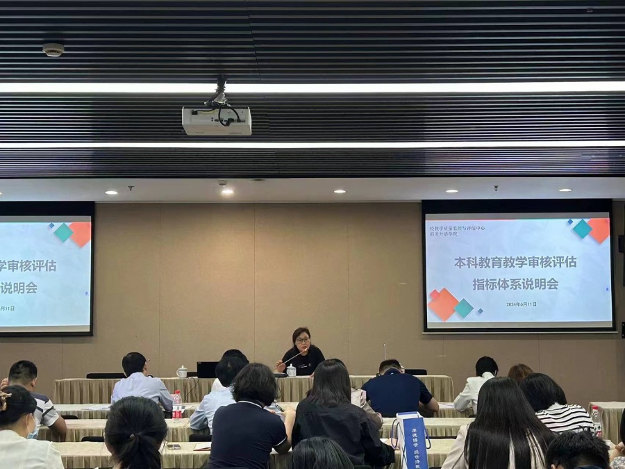 为进一步凝聚共识、明确目标、压实责任,有序推进本科教育教学审核评估工作,6月11日下午,商务外语学院在奉浦校区综合楼422会议室召开本科教育教学审核评估指标体系说明会。会议邀请校教学质量监控与评估中心副主任池丽华对本科教育教学审核评估指标体系进行讲解说明。商务外语学院领导班子、学院全体教职工出席了会议。商务外语学院副院长白莲花主持会议。