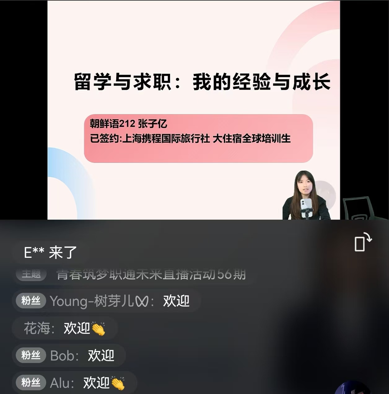 张子亿目前已入职上海携程国际旅行社,成为大住宿全球培训生中的一员,同时她也收到了国外学校的录取通知书。在留学申请与求职经验分享环节,张子亿倾囊相授。她分享了自己从计划留学到投身求职的转变过程,剖析了这一过程中的考量因素,为面临类似抉择的同学提供了参考。针对求职关键环节,张子亿详细阐述了简历制作的要点,强调内容精准匹配岗位需求的重要性;同时分享了面试技巧,建议同学们提前了解企业和岗位信息,做到有备无患。面对同学们在弹幕中提出的关于实习经历的疑问,她表示,实习不仅能够积累实践经验,还能帮助同学们深入了解行业动态,在求职竞争中占据优势。