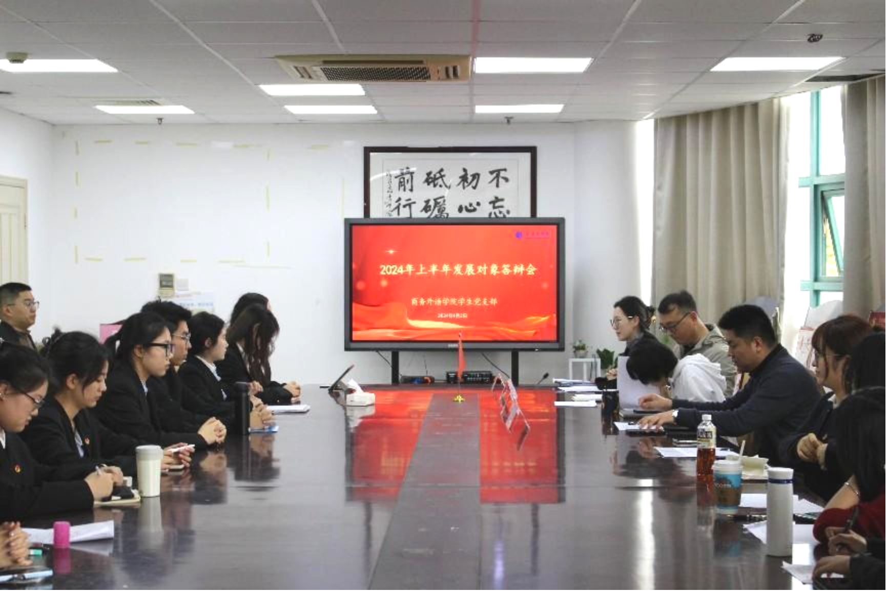 为进一步做好发展党员工作,严格把控党员“入口关”、发展“质量关”,4月2日下午,商务外语学院学生党支部于行政楼407会议室召开2024年上半年发展对象答辩会。学院党总支副书记、副院长胡安华出席会议并讲话。学生党员、入党积极分子、普通学生代表以及入党联系人代表担任观摩会议并担任评委。会议由支部书记杨悦主持。