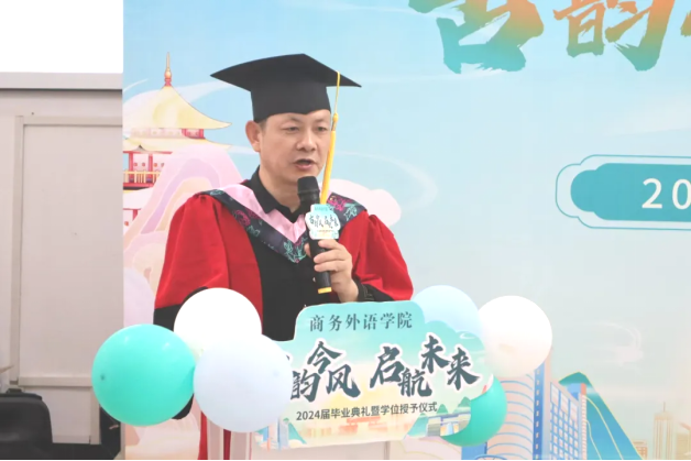 商务外语学院党总支副书记、院长段俊晖为本次毕业典礼致辞,他用英语、日语、朝鲜语三种语言向各位师生表达了亲切的问候,对毕业生们顺利毕业表示热烈祝贺。接着,他全程用英语表达了对同学们寄予的厚望。他表示,我们正处在与伟大的时代同向同行的时代,也是实现第二个百年奋斗目标的建设者和见证者,毕业生们应该积极投身于祖国建设的伟大事业中,不畏艰难,勇往直前,在奋斗中成就自我。他强调了知识的力量和终身学习的重要性,鼓励毕业生们保持好奇心和探索精神,不断追求卓越,无论毕业生们的未来道路如何,母校永远是他们坚实的后盾。他鼓励毕业生们以热血和智慧,绘就一幅幅壮丽的画卷,在青春的征途上勇于挥洒汗水、奉献自我,以高尚的情操,铸就无悔的辉煌,让每一次奉献,都成为塑造未来的坚实基石,共同谱写一曲时代的赞歌。最后,段院长为毕业生们送上诚挚祝福,“青春不散场,归来仍是少年,生活不止诗和远方,还有商务外语学院这个老地方。”