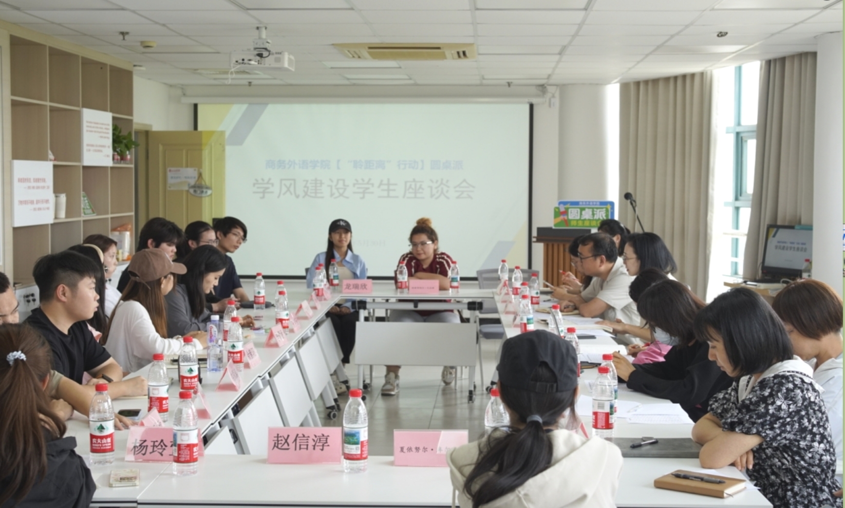 为推进本科教育教学审核评估工作走深走实,切实加强学院学风建设,进一步提升人才培养质量5月30日下午商务外语学院行政楼407会议室召开聆距离行动圆桌派学风建设学生座谈会。商务外语学院领导班子成员、专业师生代表参加会议。会议由学院党总支副书记、副院长胡安华主持。