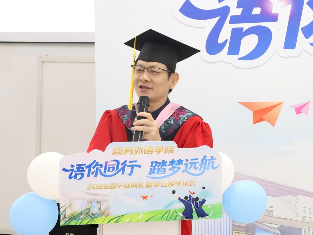 紧接着,党总支副书记、院长段俊晖发表了热情洋溢的致辞。他首先向顺利完成学业的毕业生们表示热烈祝贺。他将四年大学时光比作“语法黑板”上的时态变迁——从“一般现在时”的懵懂到“将来进行时”的昂扬,用文学隐喻勾勒学子的成长轨迹。他以三组“悖论修辞”寄语未来:做“温柔的叛逆者”,在跨界中坚守中国底色;要“精确地迷航”,在算法时代捕捉规则之外的机遇;当“浪漫的实用家”,用语言搭建文明对话的桥梁。他引用改编莎士比亚十四行诗祝福毕业生,与毕业生齐唱《凤凰花开的路口》,叮嘱学子们:“人生不是等待暴风雨过去,而是学会在雨中起舞。”最后,他以韩、日、英三语道贺,愿毕业生们在跨文化语境中,让青春成为“最动人的未完成时”。