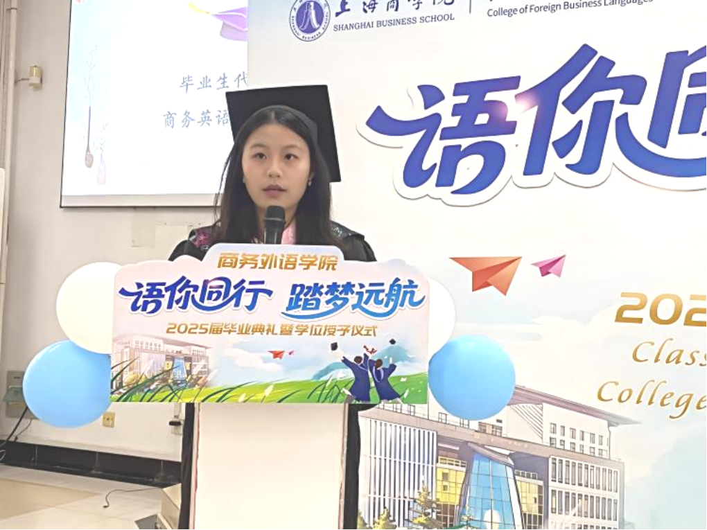 商务英语211班陈媛作为毕业生代表发言,分享了自己的成长感悟与未来展望,感谢学院的悉心培养和老师们的谆谆教诲。他鼓励学弟学妹们坚定信念,切莫因一时困境而自我怀疑。每个人身上都蕴藏着无限潜力,每一次挑战都是成长的宝贵契机。她祝愿学弟学妹们带着这份勇气与信心,无畏前行,在人生的新篇章中绽放属于自己的光芒。