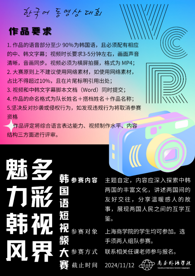 此次“魅力韩风,多彩视界”短视频大赛不仅为学生们提供了一个展示自我、交流文化的平台,更是一次成功的文化交流活动,加深了中韩两国文化的相互理解和尊重,为未来的文化交流与合作奠定了坚实的基础。上海商学院商务外语学院将继续致力于推动国际文化交流,为培养具有国际视野和跨文化交际能力的人才贡献力量。