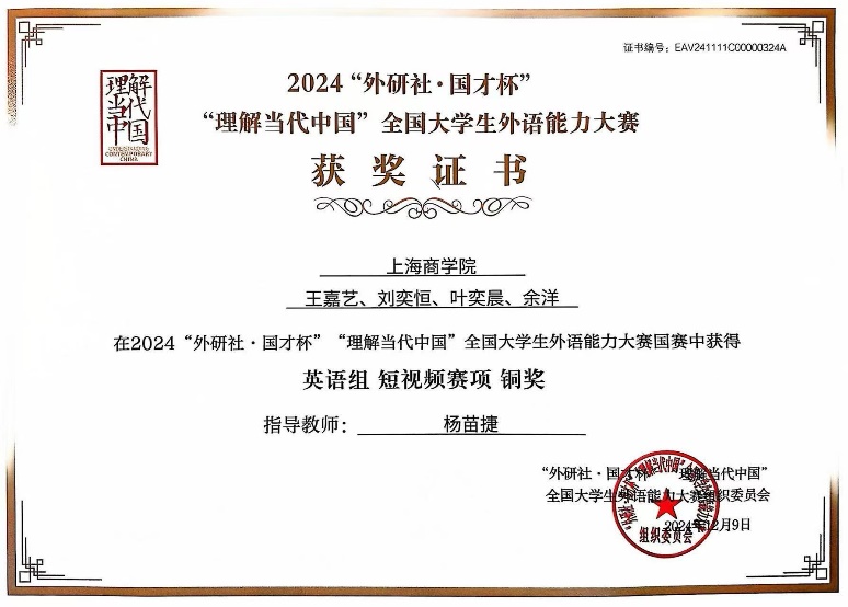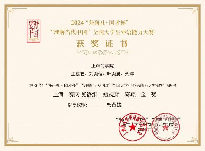 近日,我校学生积极参加2024“外研社·国才杯”“理解当代中国”全国大学生外语能力大赛英语组短视频赛项,并且是首次参加该赛项,就取得卓人成绩:1组国赛铜奖和上海市金奖、1组上海市银奖、4组上海市铜奖。其中,荣获上海市金奖的短视频作品《沪数新生》(获奖学生:酒店管理232班王嘉艺、刘奕恒、叶奕晨、余洋,指导教师:杨苗捷)成功晋级国赛,并喜获国赛铜奖的好成绩!这是我校学生在2024“外研社·国才杯”“理解当代中国”全国大学生外语能力大赛所有赛项中唯一晋级国赛并获奖的奖项,实现了该赛项零的突破,也是我校继2015年有一位学生晋级该大赛演讲赛项国赛并获奖之后,第二次学生晋级国赛并获奖!