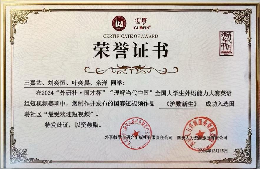 另外,国投人力公司(国聘平台)作为2024“外研社·国才杯”“理解当代中国”全国大学生外语能力大赛短视频赛项的协办单位之一,在国聘社区特别设置了英语组短视频赛项“最受欢迎短视频”榜单,排名前10的短视频作品将获评“最受欢迎短视频”。结果,我校学生(酒店管理232班王嘉艺、刘奕恒、叶奕晨、余洋)制作并发布的短视频作品《沪数新生》排名第6,成功入选国聘社区“最受欢迎短视频”奖项。