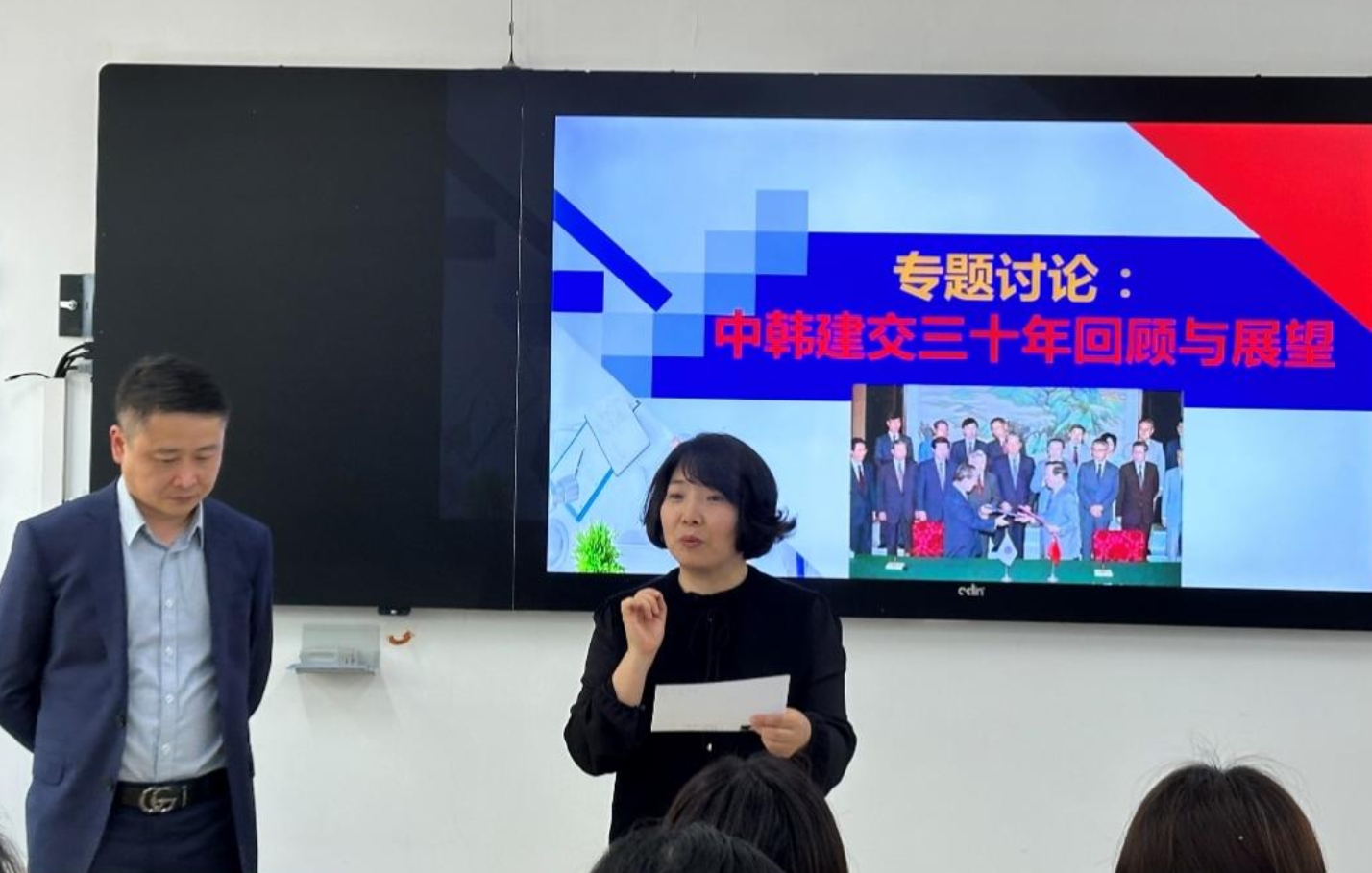 5月14日,复旦大学外文学院朝鲜语系主任郭一诚副教授应邀为我校朝鲜语专业的师生带来了题为“中韩建交三十周年回顾与展望”的专题讲座,讲座由我校朝鲜语系副教授申美花老师主持。郭一诚老师主要研究方向为中韩词汇对比、中韩语法化对比等,出版专著《中韩感觉形容词对比研究》,主编及参编教材6部,在国内外学术期刊发表论文10余篇。现兼任中国韩国(朝鲜)语教育研究学会副会长、韩国国语学会海外理事、韩国国语国文学会国际理事、期刊《中韩语言文化研究》、《韩国学研究》编委等学术兼职。