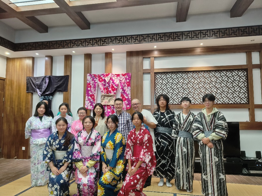 除了茶道体验外,活动还特别设置了和服试穿环节。张园园老师与外教森老师亲自为同学们演示和服的穿衣方法,从内衣到外套,从腰带到配饰,每一个细节都力求完美还原传统和服的风貌。在老师们的帮助下,同学们穿上了色彩斑斓、图案精美的和服,仿佛穿越时空,置身于古代日本的优雅氛围中。他们纷纷拍照留念,记录下这一难忘的瞬间。